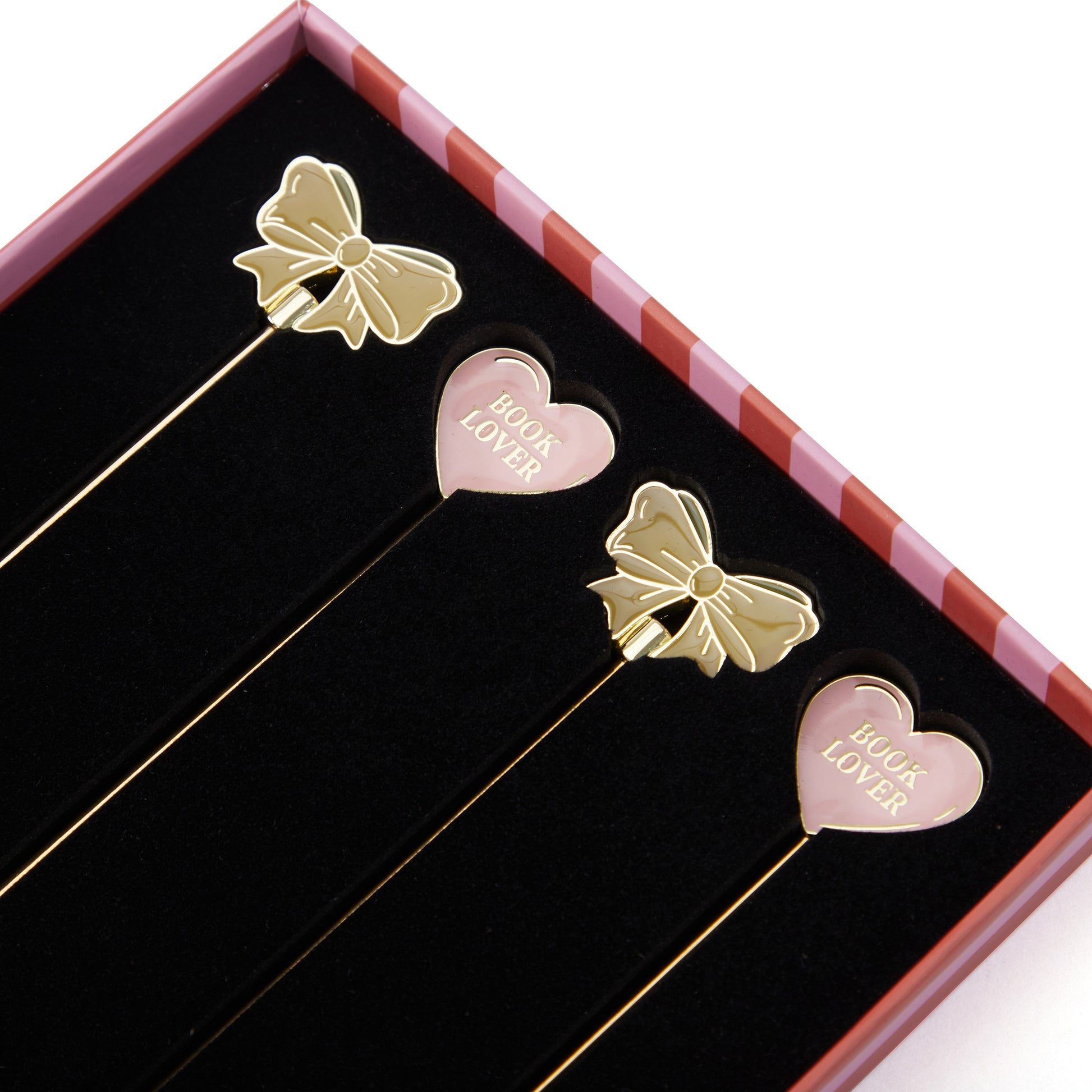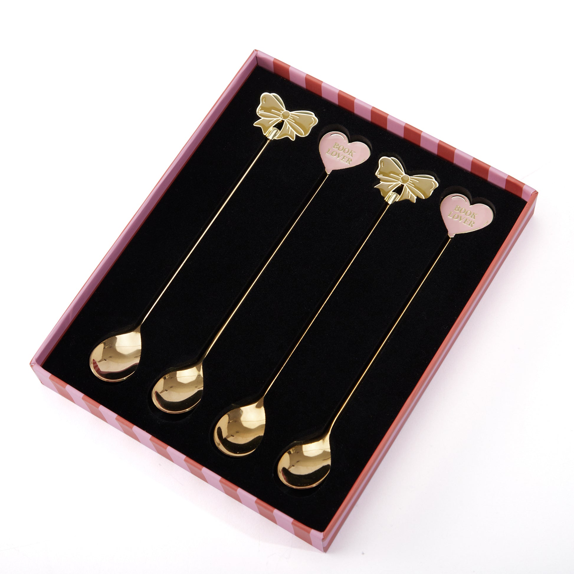 Add a little sparkle to your next book club night (or solo spicy chapter sesh). This set of four gold-tone stirrers features pink enamel hearts and bows with Book Lover details — perfect for cocktails, mocktails, or a bougie iced coffee moment. Comes in a signature BR&B striped box for easy gifting.