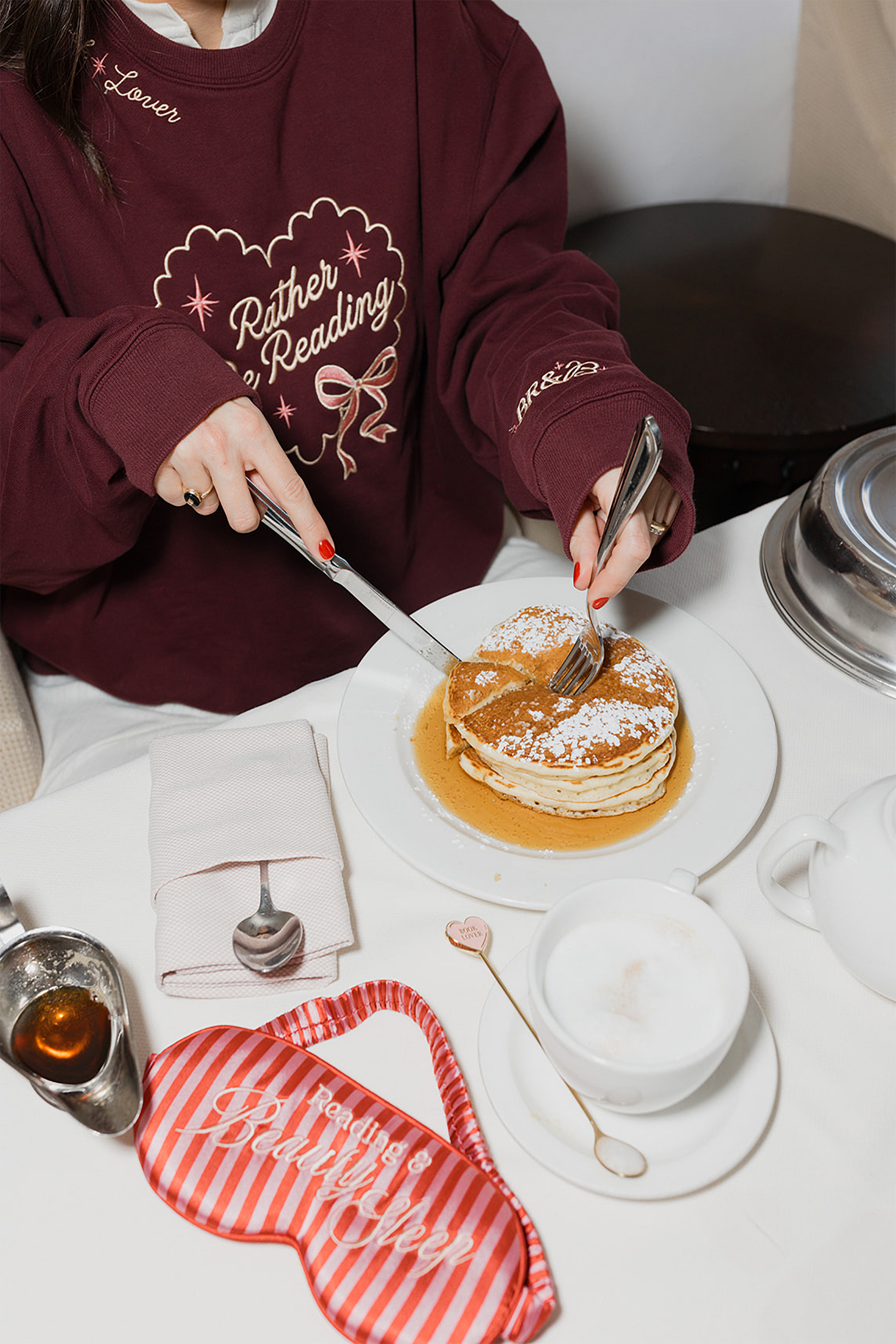 This silky-soft set includes a striped embroidered eye mask, one reversible scrunchies, and a satin storage pouch — perfect for winding down after spicy chapters and waking up like the main character